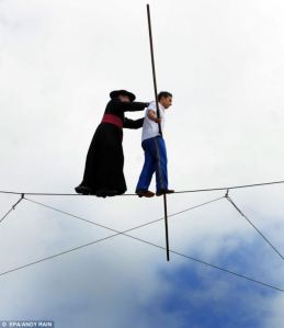 This Church in England belongs to the jurisdiction of a long-established Canadian branch of the Old Roman Catholic Church. Here I have portrayed Fr Lloyd doing his famous stunt on a tightrope, and I think he has done something good for charity, and this is praiseworthy. I have been in a sailing regatta for Aid to the Church in Need (much less dangerous!), and we get a considerable amount of enjoyment out of these events.