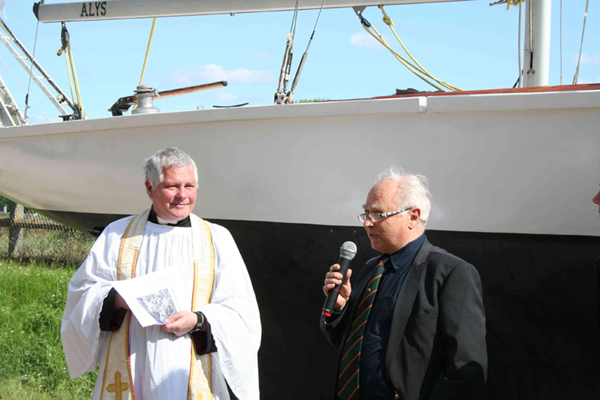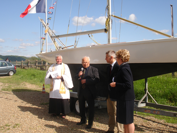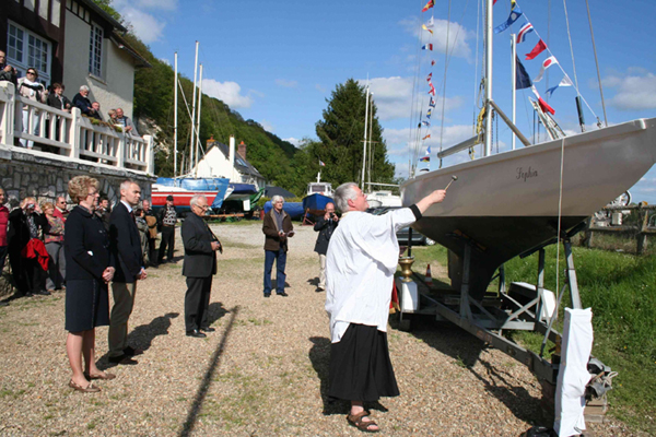 The ceremony was simple, beginning with words of welcome from the president of the yacht club, the association that financed the restoration work and the local Mayor. I then gave my own address from a more specifically spiritual point of view, then blessed the boat using a beautiful Eastern Orthodox prayer, and finally sprinkled her with holy water. The Mayor then officially named the yacht and broke the bottle of champagne against a metal member of the boat’s trailer rather than running the danger of damaging the hull. The bottle exploded with a dull pop, and its contents soaked into the ground. Tradition was followed.