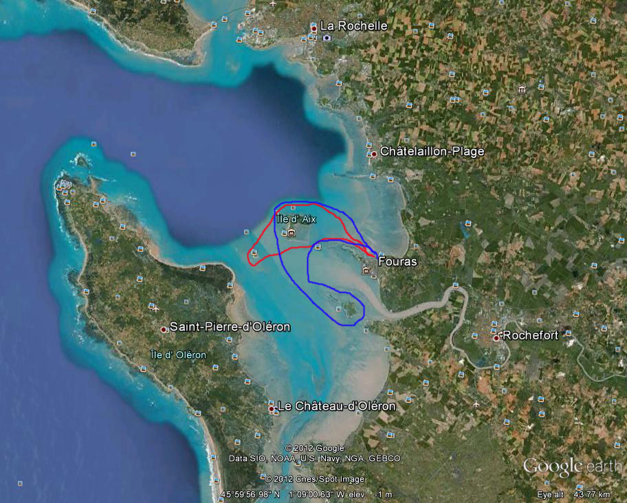Feeling adventurous and faced with little in the way of waves and swell, I could go much further in a moderate wind. I went on three long cruises, the first to and from the Ile D’aix, the second represented in red and the third in blue. The red and blue trips would have been about ten nautical miles, and each took three hours on the round trip.