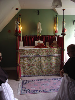 Fr Venuti takes inspiration in this little altar in the guest house chapel of Ealing Abbey. So did I to some extent, as my chapel shows, especially for the exact appearance of a hanging pyx. Downside Abbey in England is also very English.