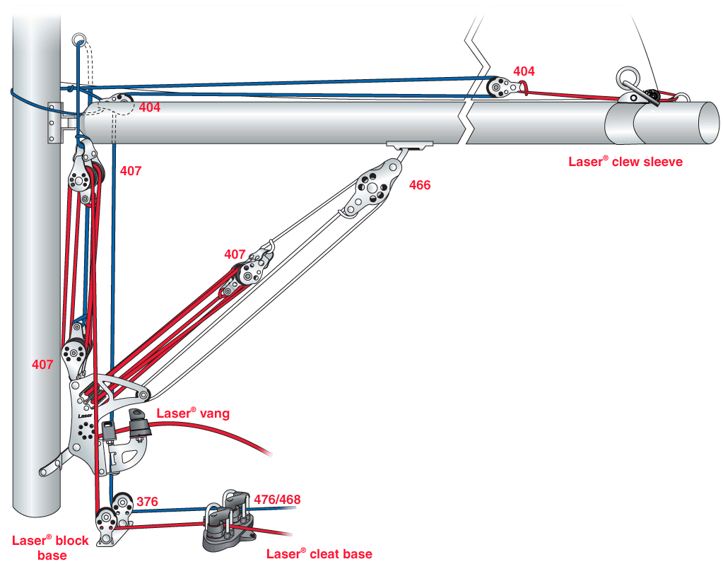 The more vertical the force, the less there needs to be a complex pulley system. The Mirror downhaul is more vertical than the 45° on most boats. The angle can be shallower if the downhaul is attached to the mast above the boat’s deck, but a higher pulley tackle ratio will be needed (4 to 6 times). For example on a Laser set up for serious racing (we see the complex outhaul and cunningham systems included in the schema):