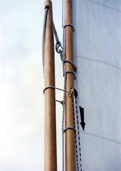 If the gaff pulls too far away from the mast, it leads to increasing difficulty in trimming the sail. The solution is some kind of lashing that is loose enough to allow the gaff to slide up and down as a sliding gunter.