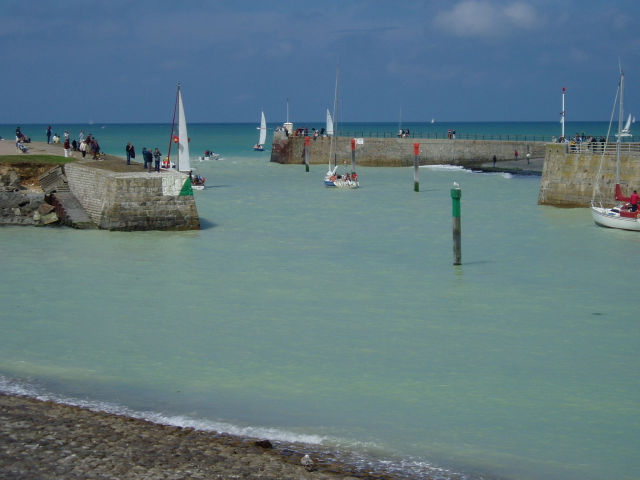 I took the boat to the port of Saint Valéry en Caux and launched from the slipway you can see on the right of the photo (port side from the sea). The yachts and fishing boats are moored in the inner part of the port where there is a dam which keeps the water in the basin when the tide is out. Using a port for launching a dinghy is of interest at high tide. The high walls create eddies with the wind, so you have to be very reactive, using puffs of wind in the sails and good strong strokes with the paddle. Once the boat has cleared the narrow entrance – the problem with this port for any boat without an engine, it is literally – plain sailing.