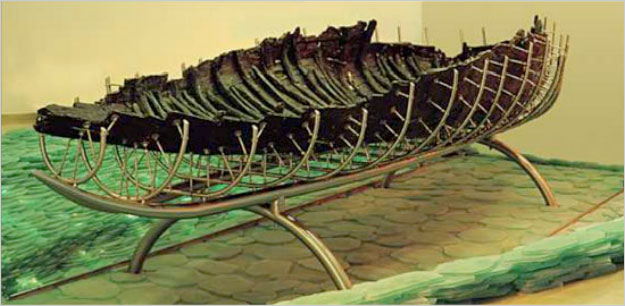 A boat dating from New Testament times was discovered in 1986 on the north-west shore of the Sea of Galilee. What is seen here would be the part of the hull that would have been under the waterline and which was preserved by the mud.