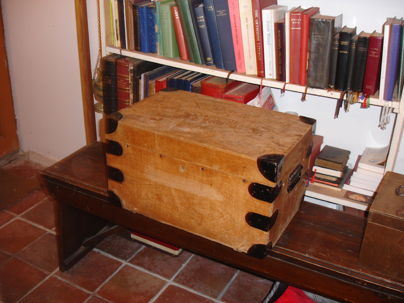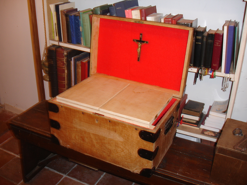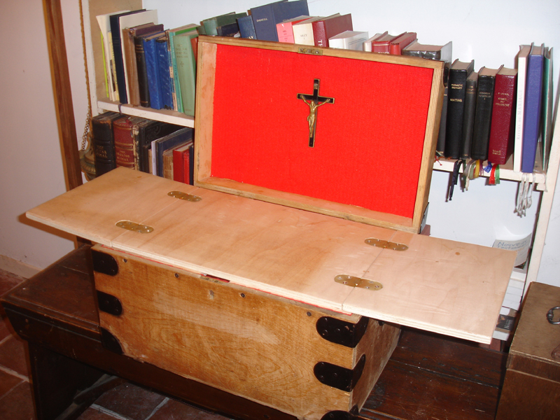 By way of a brief digression, going to boarding school was a wise decision of my parents. It was emotionally hard, but it gave us independence and brought us to make more efforts to socialise. It even brought us to appreciate home and family life much more. I am grateful to have had such an education. The tuck box was the only privacy we had, a symbol of our secret loves and longings. After I left school, I used my tuck box for woodworking tools and it lay disused for some years in the attic at home. When I was ordained a priest, I considered the possibilities of making a portable chapel. My old tuck box was the obvious solution.