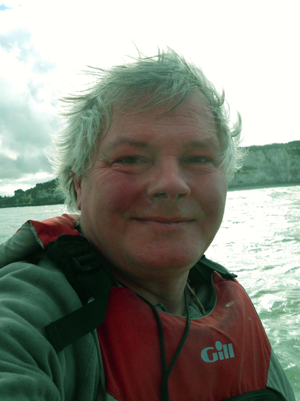 I was now out to sea, and the tide was still coming in, in the same direction as the tidal current, and gave a fairly smooth swell. The wind was quite unstable and gusty and the waves gave some quite exciting surfing as I ran to the east with the almost high tide. This view looks to the east with Veules les Roses. The headland in the furthest distance is Varangeville near Dieppe.