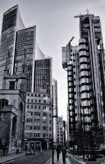 Whatever may be said in praise of modern architecture, the impression on me is one of those dystopian science fiction films. The medieval church and pre-war office block are dwarfed by the new monuments to Mammon and the abolition of humanity.
