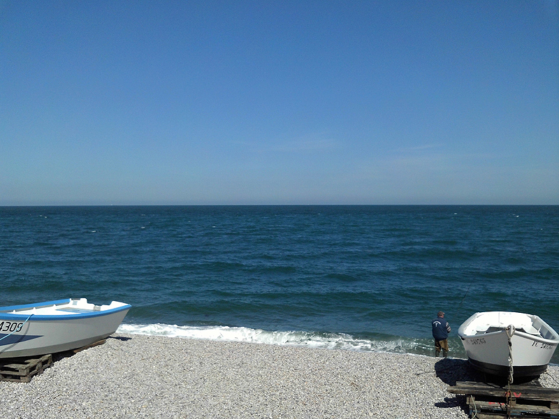 Unfortunately it wasn’t possible to launch a boat from the beach today due to substantial breaking waves and the wind exactly perpendicular to the beach. You can’t fall off the wind without being beaten back onto the beach by the waves, and probably having the boat broached, rolled over and the mast and rigging broken. I didn’t even try it. The weather was beautiful today after several weeks of rain and high winds. The wind was about ten knots and a dozen in the gusts, but the old westerly swell from the Atlantic persisted, combining with the chop from the north-east and a brisk tidal current. Below, the beach of Etretat looking east with the mariners’ chapel up on the cliff. The fishing boats are pulled up onto the beach and tied up.