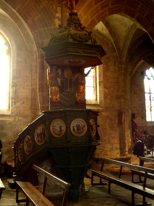 I am just back from Brittany and a fine two-week holiday of sailing and visiting. One thing we found surprising here in west Brittany is the good condition of the many fine medieval churches and a relative absence of baroque “accretions”. Perhaps my title is a little misleading because the first photo of this series, the Lady Chapel of Pont l’Abbé, is full seventeenth-century baroque. This church is full of surprises as many in this part of the country are. Perhaps Brittany remained poorer than other parts of France, and things happened more gradually. The architecture of the Breton medieval church is very “English” with the squared-off east wall and great window over the altar. In most parts of France, the east end of a church is finished off with an apse.