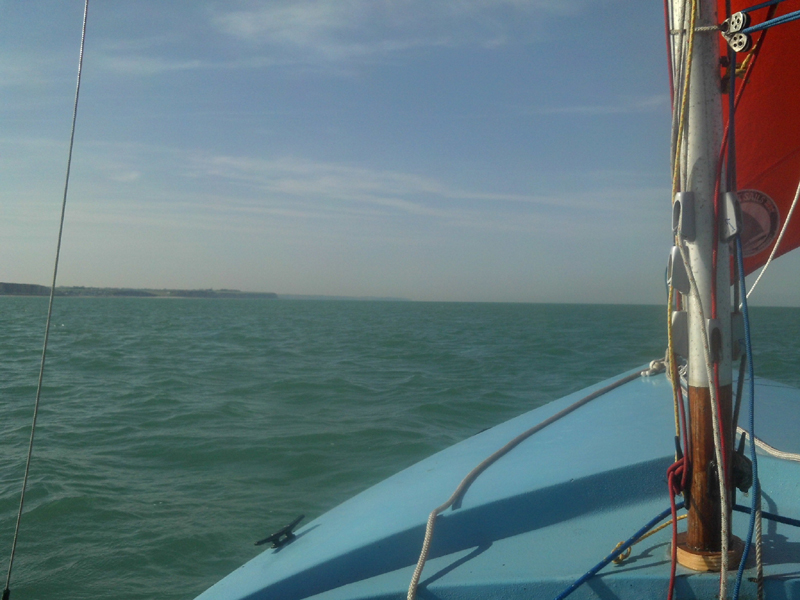 I found that the jib sheet cleats were a tad out of reach, and have since screwed them to each side of the thwart. I sailed about six nautical miles to the east, almost to Varengeville from Veules les Roses, and then back to the beach in time to land on sand. This is a fibreglass boat, not rotomoulded polypropelene like Sophia. Fibreglass is light and strong, but brittle and will break on impact with rocks! One has to be careful.