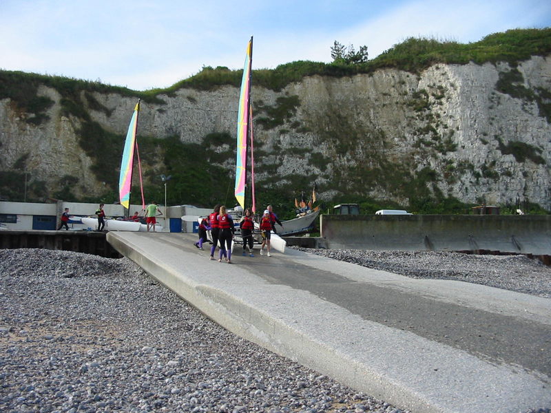 My first lessons with a patient young Breton were on the Lac du Caniel, the place where the local sailing school teaches beginners and children. I then graduated to sailing catamarans on the sea at Veules les Roses. This was on 12th August 2008. I have no photos of my first outing on a two-hander (14-foot Topaz Magno). The first impression of sailing upwind is being on a razor edge or learning to ride a bicycle. You have to have the balance between the wind in the sail, the contrary pressure of the person sailing the boat on the weather gunwale and the helm.