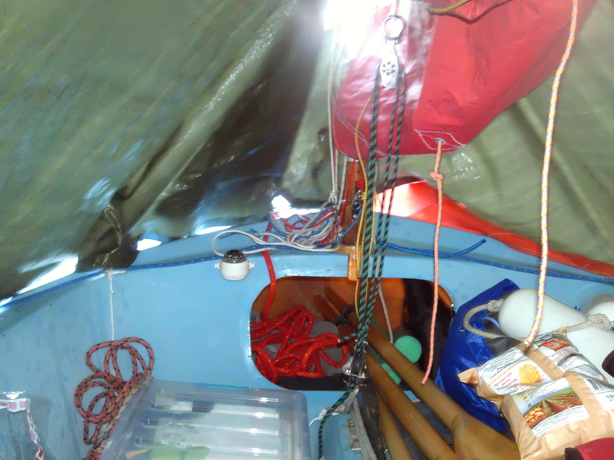 The first thing is to remove the two halyards from the boat’s gaff / yard and the topping lifts (which prevent the boom from going into the bottom of the boat when the mainsail is lowered). Next, there is a support made from two hinged pieces of wood to hold the gaff / yard and the boom at a set height at the stern. Then a tarpaulin / rudimentary tent is thrown over the gaff / yard and hooked to some brass rings screwed into my gunwale. Fore and aft, the tent needs to be attached from outside – from neighbouring boats, on the beach or by standing in the water if it is shallow enough. That creates a very cramped space as can be seen in the photo above. Bedding consists of a self-inflating mattress, a sleeping bag, an inflatable pillow and a camping pillow. The legs squeeze between the centreboard casing and the floatation chamber at the side of the hull, under the thwart. My torso and head had more space at the stern as long as the tiller of the rudder was pushed over and lashed.