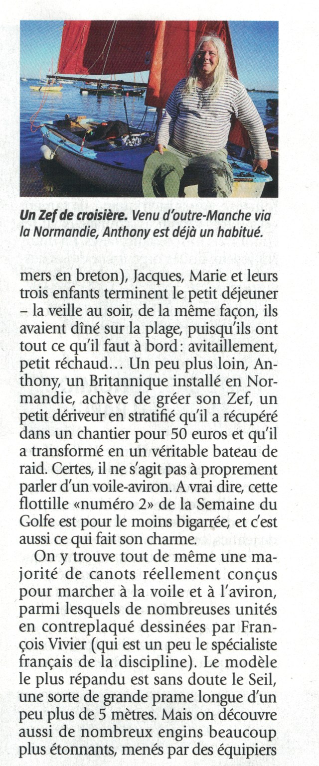 A little further [along the row of beached boats], Anthony, an Englishman living in Normandy, is completing his rigging of his Zef, a little dinghy in laminated fibreglass he bought from a boatyard for 50 euros and which he transformed into a real cruising boat. Certainly, it can’t properly be called a voile-aviron [only wooden boats with traditional rigs have this privilege, even though mine sails and rows]. Frankly, this flotilla “number 2” of the Semaine du Golfe is at least extremely varied, and this is what makes its charm.