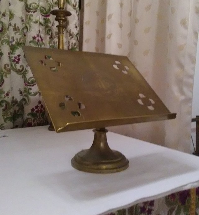 I bought it cheaply from a church that also sold me its organ. It is much more stable than my new wooden stand and will take heavier books, but not the big Roman and English missals that were published in the early twentieth century.