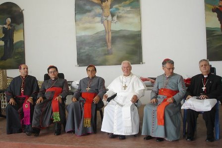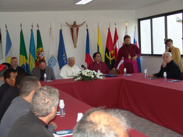 I took the photo above in Portugal at a meeting in October 2004 hosted by Archbishop Antonio José da Costa Raposo to work out a project of a Council of National Catholic Churches. The prelate in white was not the Pope but Bishop Luis Castillo Mendez who was until his death in 2009 at the head of the Igreja Católica Apostólica Brasileira. I went there as a bishop representing two priests and myself with a small number of faithful in France. As things turned out, I had never seen such an unruly mob of bishops, and the row became quite nasty. With my more than limited knowledge of the Portuguese language (I could understand something on account of my Italian and French), there was a bid by Bishop Raposo to take over a union of ICAB-origin national Catholic churches including the Brazilians. There was a row, and nothing was achieved other than a small union of churches in Portugal, Eastern Europe and Canada under +Raposo. We were there for several days, and one feature was a trip to Fatima, and I was able to talk with some of the bishops in a commonly understood language. Some were apparently devout as they prayed at the shrine of Our Lady of Fatima. I met Bishop Josivaldo Pereira de Oliveira whose name reminded me of my moral theology professor at Fribourg (Carlos-Josaphat Pinto de Oliveira). He seemed honest and kind, and spoke French. Bishop Castillo Mendez was most certainly on his last legs (he still had five years to go), almost blind, and was still consecrating bishops to the last! I left Lisbon and flew back to Paris as I came, confused and disappointed. I was not interested in the little Raposo group, and my confidence in the Brazilians as a whole collapsed. That was enough for me! I returned home to my little house in the Vendée.